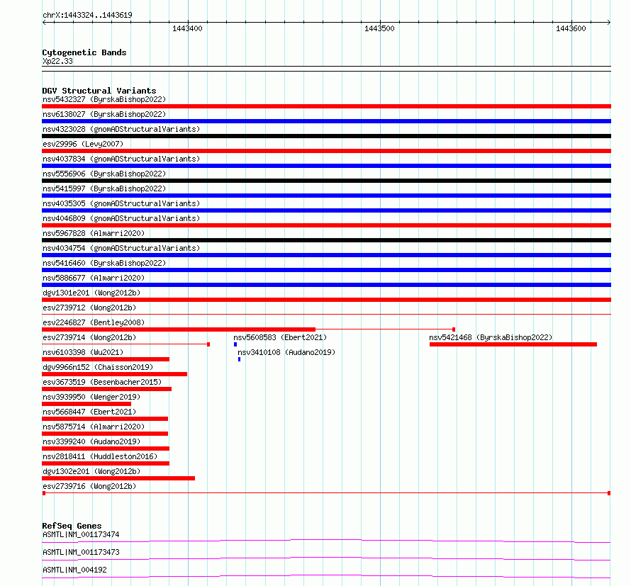 Variant DetailsVariant: esv2739716| Internal ID | 10323352 | | Landmark | | | Location Information | | | Cytoband | Xp22.33 | | Allele length | | Assembly | Allele length | | hg38 | 296 | | hg19 | 296 |