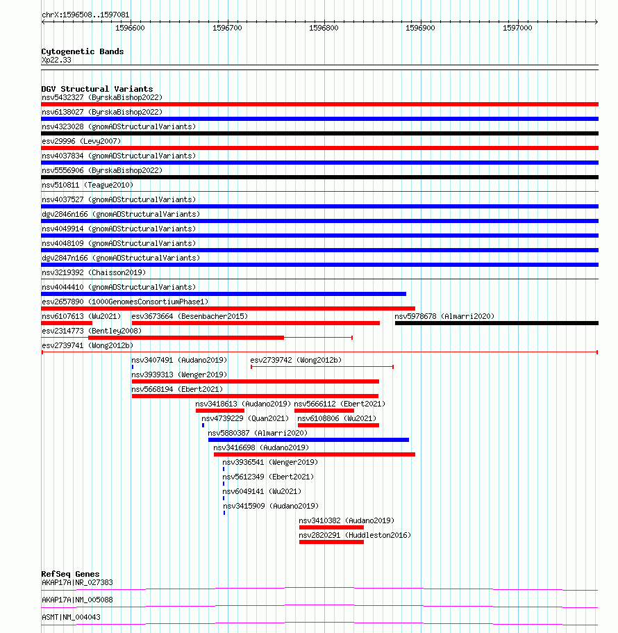 Variant DetailsVariant: esv2739741| Internal ID | 10323377 | | Landmark | | | Location Information | | | Cytoband | Xp22.33 | | Allele length | | Assembly | Allele length | | hg38 | 574 | | hg19 | 574 |
