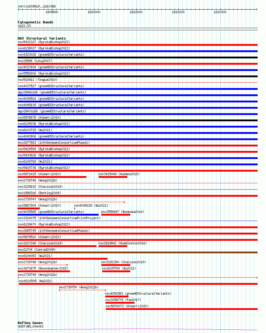 Variant DetailsVariant: esv2739749| Internal ID | 10323385 | | Landmark | | | Location Information | | | Cytoband | Xp22.33 | | Allele length | | Assembly | Allele length | | hg38 | 568 | | hg19 | 568 |