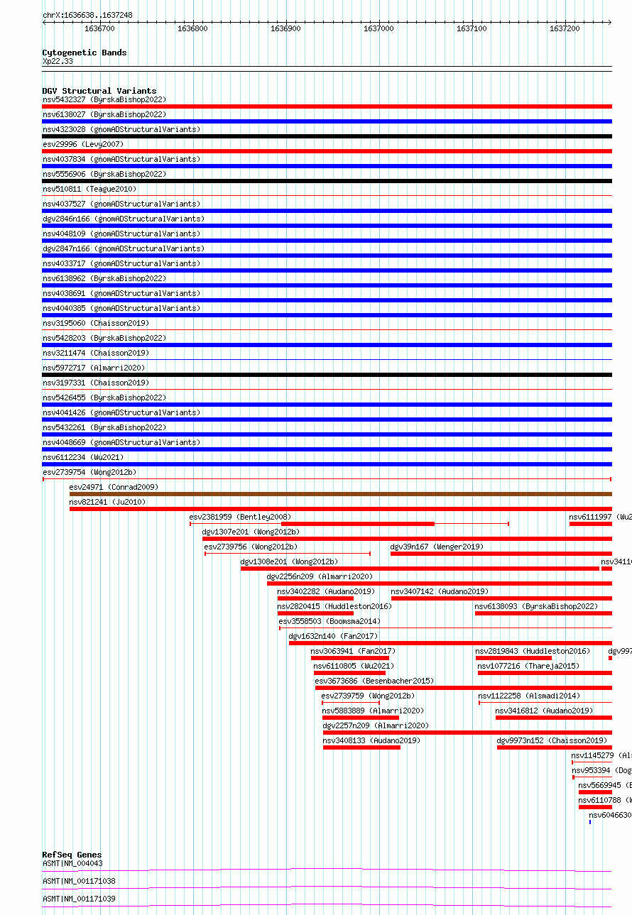 Variant DetailsVariant: esv2739754| Internal ID | 10323390 | | Landmark | | | Location Information | | | Cytoband | Xp22.33 | | Allele length | | Assembly | Allele length | | hg38 | 611 | | hg19 | 611 |