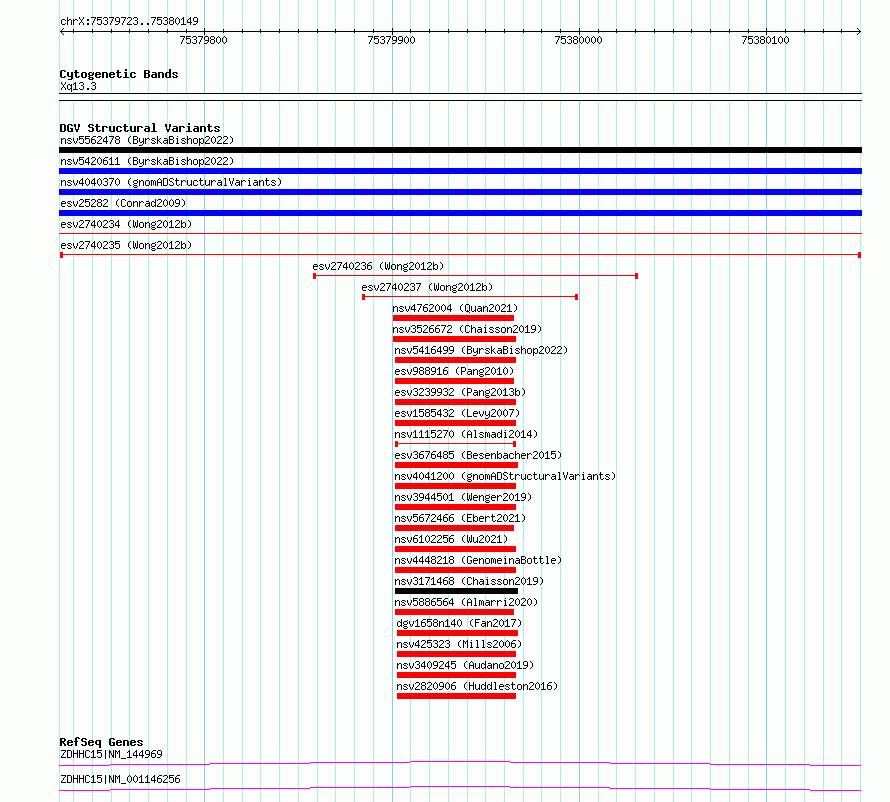 Variant DetailsVariant: esv2740235| Internal ID | 10323871 | | Landmark | | | Location Information | | | Cytoband | Xq13.3 | | Allele length | | Assembly | Allele length | | hg38 | 427 | | hg19 | 427 |