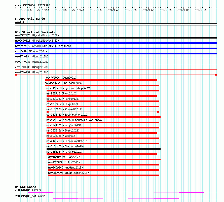 Variant DetailsVariant: esv2740237| Internal ID | 10323873 | | Landmark | | | Location Information | | | Cytoband | Xq13.3 | | Allele length | | Assembly | Allele length | | hg38 | 115 | | hg19 | 115 |