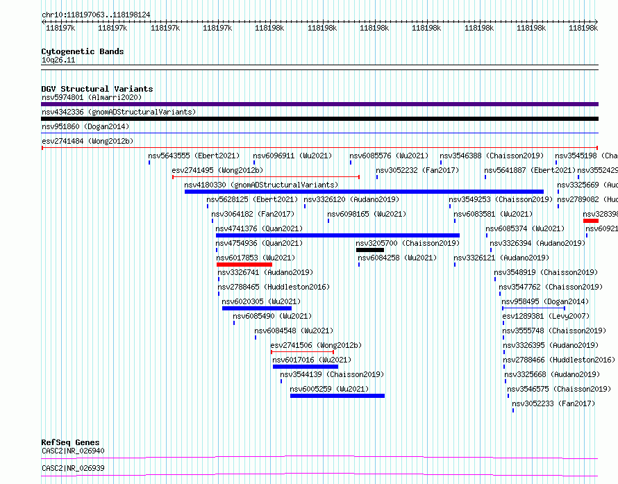 | | Variant Type | CNV deletion | | Copy Number | | | Allele State | | | Allele Origin | | | Probe Count | | | Validation Flag | | | Merged Status | M | | Merged Variants | | | Supporting Variants | essv6965363, essv6931564, essv6924079, essv6882140, essv6908613, essv6862081, essv6819408, essv6850779, essv6706264, essv6958825, essv6787506, essv6755348, essv6681351, essv6906952, essv6698583, essv6765627, essv6769609, essv6856801, essv6876467, essv6672748 | | Samples | SSM008, SSM027, SSM087, SSM038, SSM088, SSM002, SSM058, SSM092, SSM018, SSM069, SSM026, SSM094, SSM031, SSM001, SSM014, SSM086, SSM033, SSM020, SSM078, SSM063 | | Known Genes | CASC2 | | Method | Sequencing | | Analysis | Breakdancer:4 times standard deviation,VariationHunter:4 times standard deviation and at least 3 supportting reads | | Platform | Illumina HiSeq 2000 | | Comments | | | Reference | Wong_et_al_2012b | | Pubmed ID | 23290073 | | Accession Number(s) | esv2741484