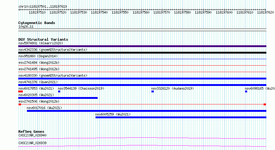 Variant DetailsVariant: esv2741506| Internal ID | 10295622 | | Landmark | | | Location Information | | | Cytoband | 10q26.11 | | Allele length | | Assembly | Allele length | | hg38 | 119 | | hg19 | 119 |