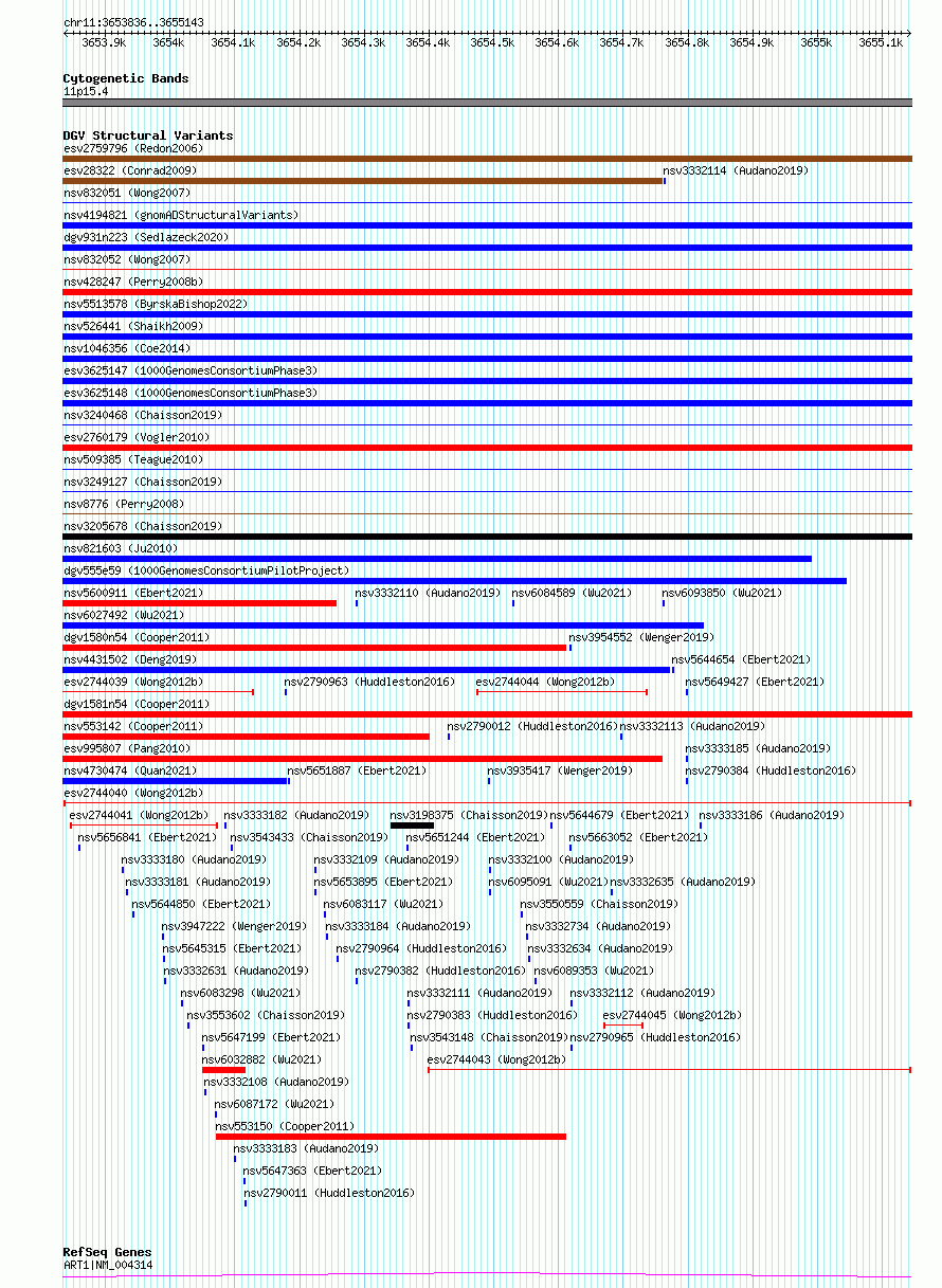 Variant DetailsVariant: esv2744040 | Internal ID | 10325010 | | Landmark | | | Location Information | | | Cytoband | 11p15.4 | | Allele length | | Assembly | Allele length | | hg38 | 1308 | | hg19 | 1308 |