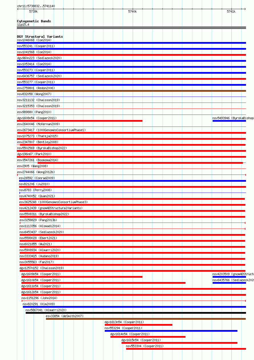 Variant DetailsVariant: esv2744066 | Internal ID | 10325036 | | Landmark | | | Location Information | | | Cytoband | 11p15.4 | | Allele length | | Assembly | Allele length | | hg38 | 2309 | | hg19 | 2309 |