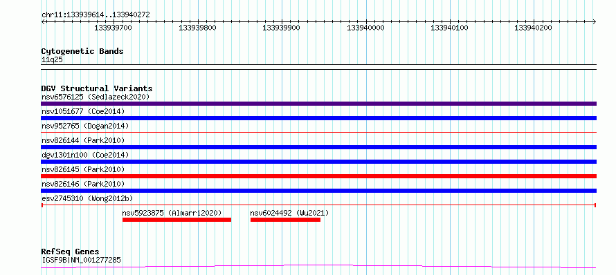 Variant DetailsVariant: esv2745310| Internal ID | 10326280 | | Landmark | | | Location Information | | | Cytoband | 11q25 | | Allele length | | Assembly | Allele length | | hg38 | 659 | | hg19 | 659 |