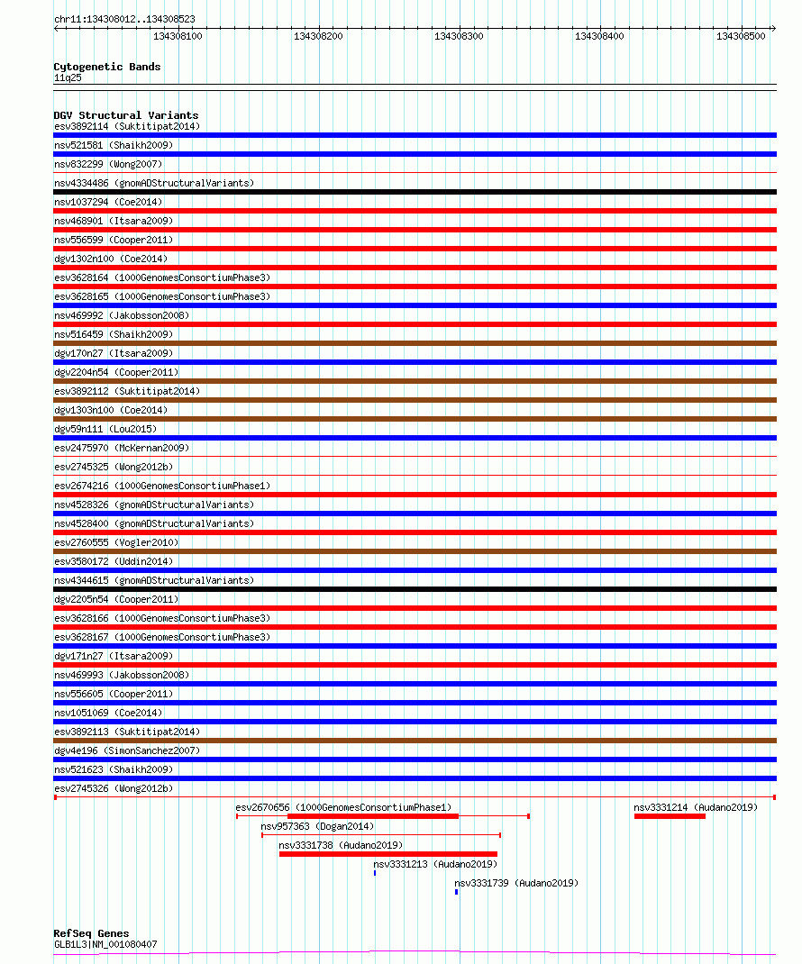 Variant DetailsVariant: esv2745326| Internal ID | 9979610 | | Landmark | | | Location Information | | | Cytoband | 11q25 | | Allele length | | Assembly | Allele length | | hg38 | 512 | | hg19 | 512 |