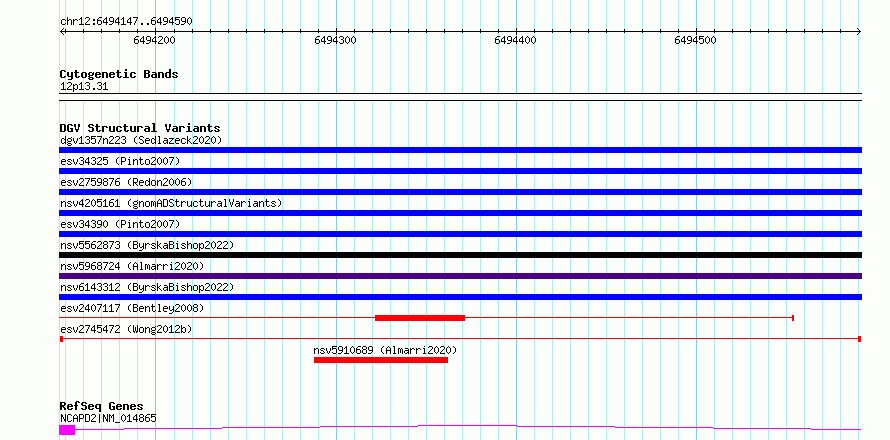 Variant DetailsVariant: esv2745472| Internal ID | 10326442 | | Landmark | | | Location Information | | | Cytoband | 12p13.31 | | Allele length | | Assembly | Allele length | | hg38 | 444 | | hg19 | 444 |