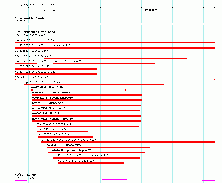 Variant DetailsVariant: esv2746291| Internal ID | 10327261 | | Landmark | | | Location Information | | | Cytoband | 12q23.2 | | Allele length | | Assembly | Allele length | | hg38 | 194 | | hg19 | 194 |