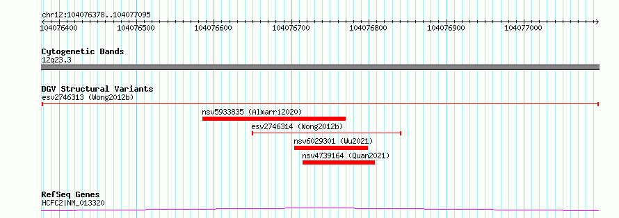 Variant DetailsVariant: esv2746313| Internal ID | 10327283 | | Landmark | | | Location Information | | | Cytoband | 12q23.3 | | Allele length | | Assembly | Allele length | | hg38 | 718 | | hg19 | 718 |