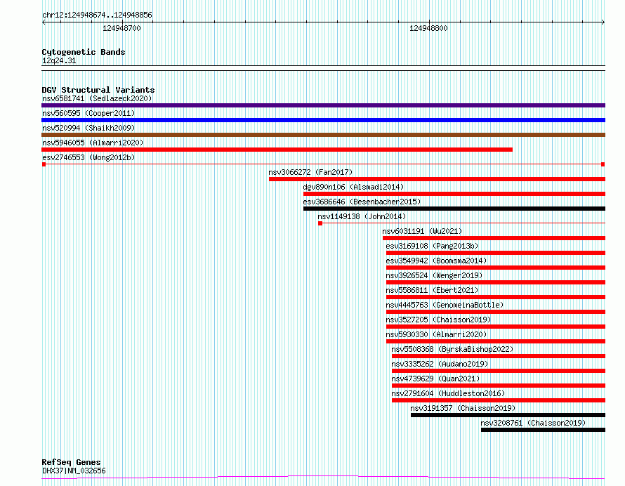 Variant DetailsVariant: esv2746553 | Internal ID | 10327523 | | Landmark | | | Location Information | | | Cytoband | 12q24.31 | | Allele length | | Assembly | Allele length | | hg38 | 183 | | hg19 | 183 |