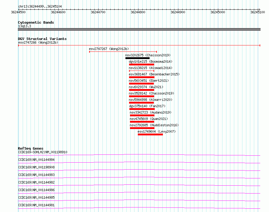 Variant DetailsVariant: esv2747266| Internal ID | 10328236 | | Landmark | | | Location Information | | | Cytoband | 13q13.3 | | Allele length | | Assembly | Allele length | | hg38 | 606 | | hg19 | 606 |
