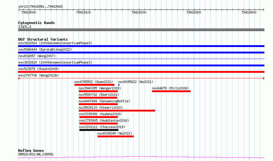 Variant DetailsVariant: esv2747706| Internal ID | 10328676 | | Landmark | | | Location Information | | | Cytoband | 13q31.1 | | Allele length | | Assembly | Allele length | | hg38 | 446 | | hg19 | 446 |
