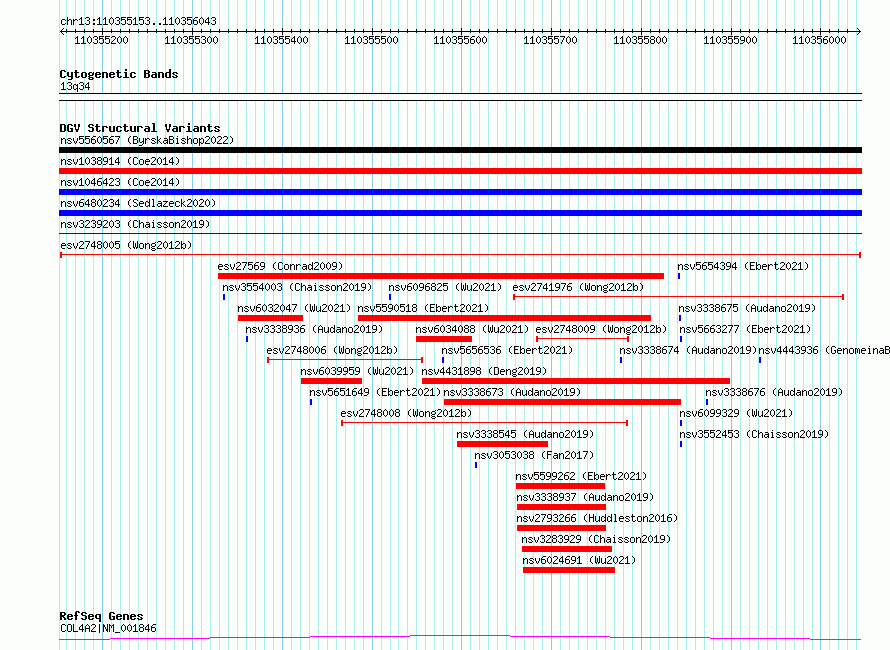 | | Variant Type | CNV deletion | | Copy Number | | | Allele State | | | Allele Origin | | | Probe Count | | | Validation Flag | | | Merged Status | M | | Merged Variants | | | Supporting Variants | essv6940559, essv6851550, essv6894847, essv6792061, essv6916314, essv6835067, essv6800431, essv6920422, essv6945181, essv6698914, essv6728526, essv6735331, essv6838819, essv6787976, essv6867433, essv6857556, essv6709678, essv6681795, essv6783773, essv6732335, essv6953453, essv6936381, essv6815635, essv6838822, essv6912817, essv6713187, essv6724692, essv6888158, essv6761123 | | Samples | SSM083, SSM045, SSM046, SSM087, SSM038, SSM042, SSM041, SSM023, SSM021, SSM047, SSM069, SSM061, SSM096, SSM089, SSM017, SSM086, SSM033, SSM068, SSM072, SSM082, SSM015, SSM016, SSM077, SSM022, SSM070, SSM025, SSM098, SSM049 | | Known Genes | COL4A2 | | Method | Sequencing | | Analysis | Breakdancer:4 times standard deviation,VariationHunter:4 times standard deviation and at least 3 supportting reads | | Platform | Illumina HiSeq 2000 | | Comments | | | Reference | Wong_et_al_2012b | | Pubmed ID | 23290073 | | Accession Number(s) | esv2748005