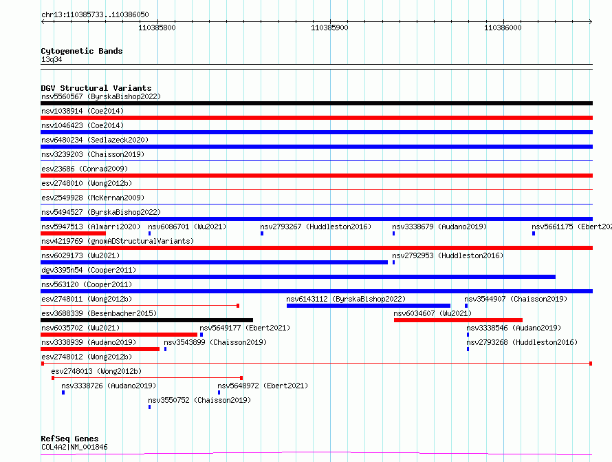 | | Variant Type | CNV deletion | | Copy Number | | | Allele State | | | Allele Origin | | | Probe Count | | | Validation Flag | | | Merged Status | M | | Merged Variants | | | Supporting Variants | essv6695782, essv6966147, essv6702672 | | Samples | SSM027, SSM039, SSM037 | | Known Genes | COL4A2 | | Method | Sequencing | | Analysis | Breakdancer:4 times standard deviation,VariationHunter:4 times standard deviation and at least 3 supportting reads | | Platform | Illumina HiSeq 2000 | | Comments | | | Reference | Wong_et_al_2012b | | Pubmed ID | 23290073 | | Accession Number(s) | esv2748012