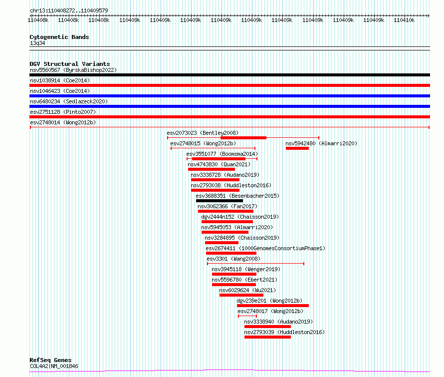 | | Variant Type | CNV deletion | | Copy Number | | | Allele State | | | Allele Origin | | | Probe Count | | | Validation Flag | | | Merged Status | M | | Merged Variants | | | Supporting Variants | essv6812378, essv6966148, essv6755740, essv6744179, essv6812379, essv6678031, essv6891462, essv6752725, essv6901243, essv6909095, essv6823851, essv6709679, essv6720898, essv6819972, essv6749837, essv6772278, essv6888160, essv6936383, essv6688457, essv6724693, essv6882489, essv6977629, essv6867732, essv6857557, essv6735265, essv6763514, essv6959627, essv6862645, essv6827944, essv6761124, essv6809561, essv6851551, essv6807676, essv6735333, essv6673505, essv6758372, essv6738055, essv6800433, essv6800434, essv6688458, essv6827942, essv6741275, essv6712421 | | Samples | SSM059, SSM027, SSM075, SSM045, SSM011, SSM079, SSM065, SSM087, SSM097, SSM009, SSM050, SSM088, SSM041, SSM057, SSM058, SSM021, SSM061, SSM029, SSM096, SSM062, SSM026, SSM035, SSM094, SSM032, SSM031, SSM044, SSM001, SSM014, SSM086, SSM006, SSM072, SSM078, SSM053, SSM080, SSM076, SSM052, SSM049, SSM056, SSM012 | | Known Genes | COL4A2 | | Method | Sequencing | | Analysis | Breakdancer:4 times standard deviation,VariationHunter:4 times standard deviation and at least 3 supportting reads | | Platform | Illumina HiSeq 2000 | | Comments | | | Reference | Wong_et_al_2012b | | Pubmed ID | 23290073 | | Accession Number(s) | esv2748014