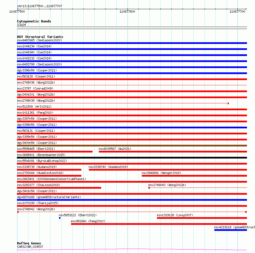 Variant DetailsVariant: esv2748042| Internal ID | 10329012 | | Landmark | | | Location Information | | | Cytoband | 13q34 | | Allele length | | Assembly | Allele length | | hg38 | 208 | | hg19 | 208 |
