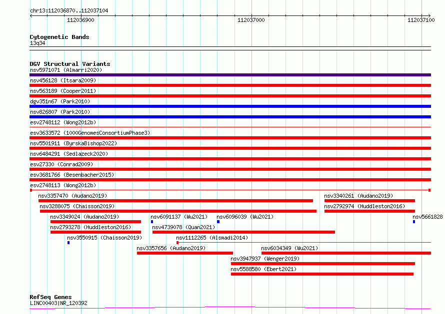Variant DetailsVariant: esv2748113| Internal ID | 10329083 | | Landmark | | | Location Information | | | Cytoband | 13q34 | | Allele length | | Assembly | Allele length | | hg38 | 235 | | hg19 | 235 |