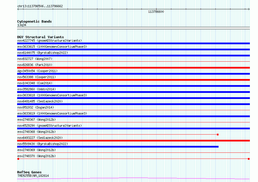 Variant DetailsVariant: esv2748370| Internal ID | 10329340 | | Landmark | | | Location Information | | | Cytoband | 13q34 | | Allele length | | Assembly | Allele length | | hg38 | 157 | | hg19 | 157 |