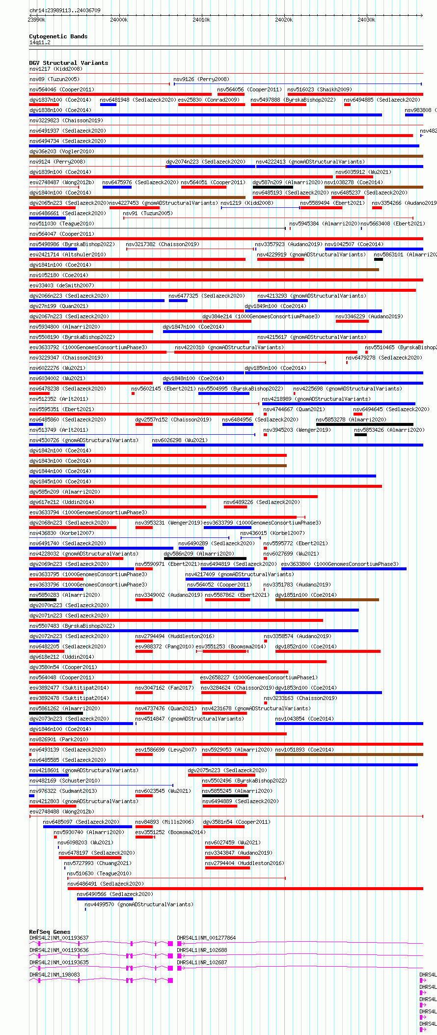 Variant DetailsVariant: esv2748488| Internal ID | 10329458 | | Landmark | | | Location Information | | | Cytoband | 14q11.2 | | Allele length | | Assembly | Allele length | | hg38 | 47597 | | hg19 | 47597 |