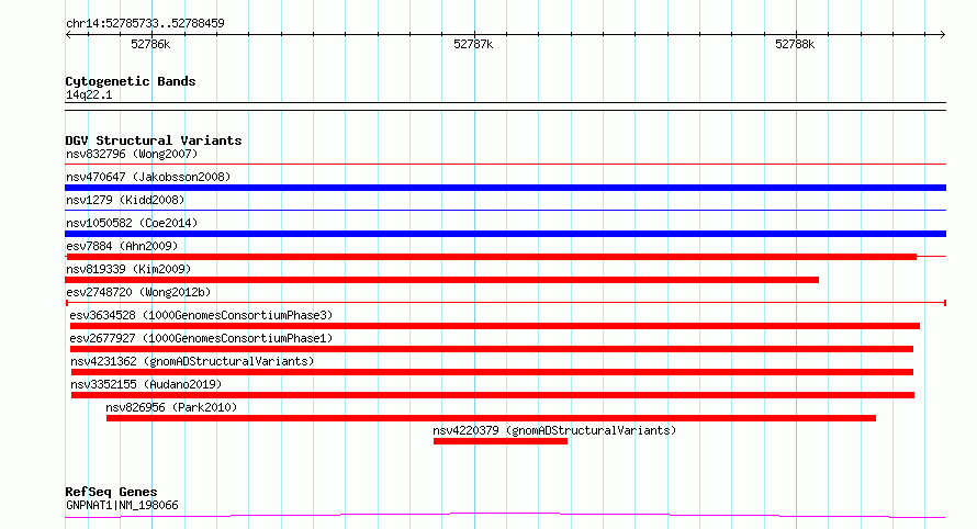Variant DetailsVariant: esv2748720| Internal ID | 9983004 | | Landmark | | | Location Information | | | Cytoband | 14q22.1 | | Allele length | | Assembly | Allele length | | hg38 | 2727 | | hg19 | 2727 |