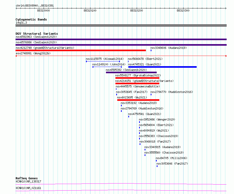 Variant DetailsVariant: esv2748991| Internal ID | 10329961 | | Landmark | | | Location Information | | | Cytoband | 14q31.3 | | Allele length | | Assembly | Allele length | | hg38 | 452 | | hg19 | 452 |