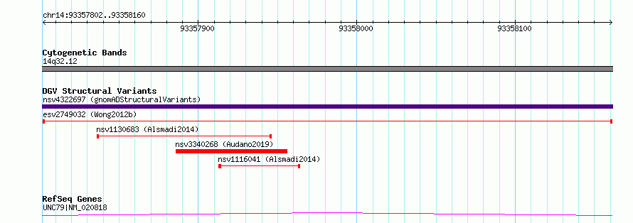 Variant DetailsVariant: esv2749032| Internal ID | 9983316 | | Landmark | | | Location Information | | | Cytoband | 14q32.12 | | Allele length | | Assembly | Allele length | | hg38 | 359 | | hg19 | 359 |