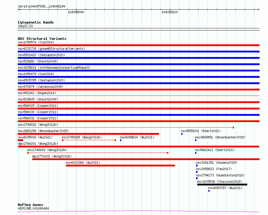 Variant DetailsVariant: esv2749182| Internal ID | 10330152 | | Landmark | | | Location Information | | | Cytoband | 14q32.33 | | Allele length | | Assembly | Allele length | | hg38 | 257 | | hg19 | 257 |