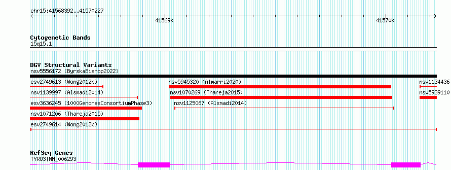 | | Variant Type | CNV deletion | | Copy Number | | | Allele State | | | Allele Origin | | | Probe Count | | | Validation Flag | | | Merged Status | M | | Merged Variants | | | Supporting Variants | essv6835245, essv6932281, essv6741331, essv6842850, essv6741342 | | Samples | SSM084, SSM082, SSM020, SSM007 | | Known Genes | TYRO3 | | Method | Sequencing | | Analysis | Breakdancer:4 times standard deviation,VariationHunter:4 times standard deviation and at least 3 supportting reads | | Platform | Illumina HiSeq 2000 | | Comments | | | Reference | Wong_et_al_2012b | | Pubmed ID | 23290073 | | Accession Number(s) | esv2749614