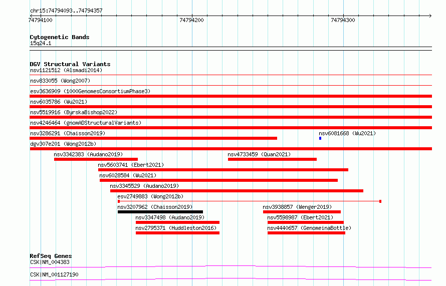 | | Variant Type | CNV deletion | | Copy Number | | | Allele State | | | Allele Origin | | | Probe Count | | | Validation Flag | | | Merged Status | M | | Merged Variants | dgv307e201 | | Supporting Variants | essv6879791, essv6788193, essv6776092, essv6809717, essv6724892, essv6706585, essv6909297, essv6857888, essv6673862, essv6901720, essv6862916, essv6755895, essv6772497, essv6942496, essv6665346, essv6869542, essv6867705, essv6842879, essv6851890, essv6800661, essv6678246, essv6871057, essv6732537 | | Samples | SSM075, SSM045, SSM011, SSM065, SSM087, SSM093, SSM088, SSM058, SSM084, SSM090, SSM047, SSM069, SSM029, SSM089, SSM032, SSM003, SSM031, SSM014, SSM086, SSM066, SSM040, SSM072, SSM012 | | Known Genes | CSK | | Method | Sequencing | | Analysis | Breakdancer:4 times standard deviation,VariationHunter:4 times standard deviation and at least 3 supportting reads | | Platform | Illumina HiSeq 2000 | | Comments | | | Reference | Wong_et_al_2012b | | Pubmed ID | 23290073 | | Accession Number(s) | esv2749882