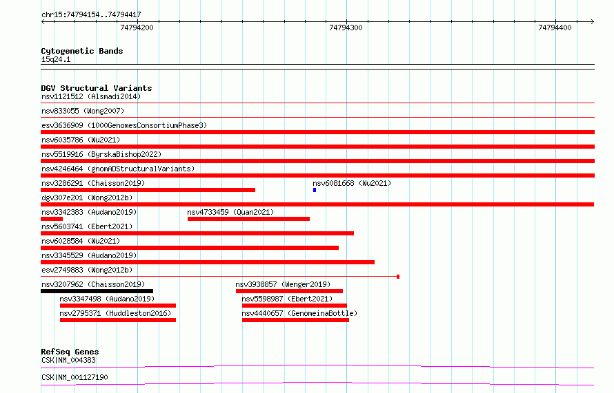 Variant DetailsVariant: esv2749884| Internal ID | 10330854 | | Landmark | | | Location Information | | | Cytoband | 15q24.1 | | Allele length | | Assembly | Allele length | | hg38 | 264 | | hg19 | 264 |