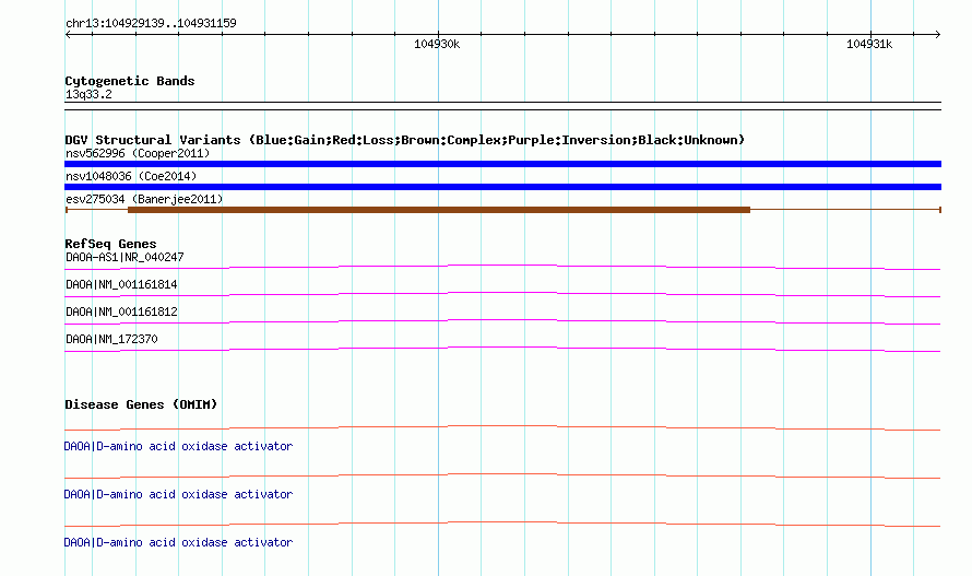 | | Variant Type | CNV gain+loss | | Copy Number | | | Allele State | | | Allele Origin | | | Probe Count | | | Validation Flag | | | Merged Status | M | | Merged Variants | | | Supporting Variants | essv2585769, essv2585841 | | Samples | | | Known Genes | DAOA, DAOA-AS1 | | Method | SNP array | | Analysis | Identification of germline Changes in Copy Number (IgC2N) | | Platform | Affymetrix SNP 6.0 | | Comments | | | Reference | Banerjee_et_al_2011 | | Pubmed ID | 21479260 | | Accession Number(s) | esv275034