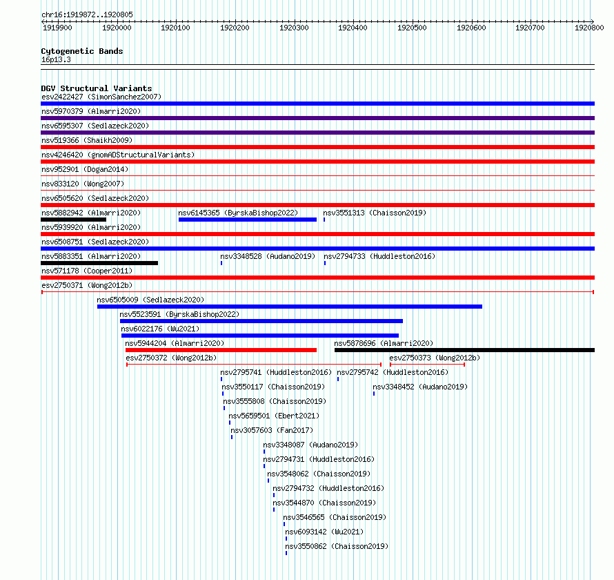 Variant DetailsVariant: esv2750371| Internal ID | 10331341 | | Landmark | | | Location Information | | | Cytoband | 16p13.3 | | Allele length | | Assembly | Allele length | | hg38 | 934 | | hg19 | 934 |