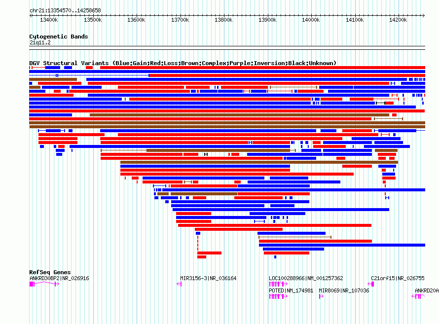 | | Variant Type | CNV gain+loss | | Copy Number | | | Allele State | | | Allele Origin | | | Probe Count | | | Validation Flag | | | Merged Status | M | | Merged Variants | esv2758809 | | Supporting Variants | essv4110, essv23753, essv21648, essv3511, essv5693, essv5642, essv20873 | | Samples | NA18999, NA18550, NA12761, NA11994, NA18529, NA18579, NA12145 | | Known Genes | ANKRD20A11P, ANKRD30BP2, C21orf15, LOC100288966, MIR3156-3, MIR8069, POTED | | Method | SNP array | | Analysis | The algorithm used to call CNVs using the 500K EA platform was developed to accurately define CNV regions using a large set of reference samples and is described in detail in a separate publication (Komura 2006). The algorithm contains three major parts: 1) Intensity pre-processing using an improved version of Genomic Imbalance Map (GIM) (Ishikawa et al. 2005), including probe selection, noise reduction, normalization, and intensity ratio adjustment based on affinity differences between alleles of a SNP, 2) CNV extraction, which identifies CNVs from all pair-wise comparisons using a modified SW-ARRAY, and 3) A copy number inference step which utilizes signal ratios and SNP information to more precisely define CNV boundaries and the copy number within each region. | | Platform | Affymetrix GeneChip Early Access Mapping 500K Set Array (250K_Nsp_SNP) | | Comments | | | Reference | Redon_et_al_2006 | | Pubmed ID | 17122850 | | Accession Number(s) | esv2756746