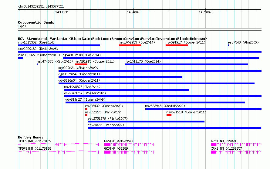 | | Variant Type | CNV gain | | Copy Number | | | Allele State | | | Allele Origin | | | Probe Count | | | Validation Flag | | | Merged Status | M | | Merged Variants | esv2759182 | | Supporting Variants | essv24627, essv24219 | | Samples | NA10846, NA12144 | | Known Genes | GK5, TFDP2, XRN1 | | Method | SNP array | | Analysis | The algorithm used to call CNVs using the 500K EA platform was developed to accurately define CNV regions using a large set of reference samples and is described in detail in a separate publication (Komura 2006). The algorithm contains three major parts: 1) Intensity pre-processing using an improved version of Genomic Imbalance Map (GIM) (Ishikawa et al. 2005), including probe selection, noise reduction, normalization, and intensity ratio adjustment based on affinity differences between alleles of a SNP, 2) CNV extraction, which identifies CNVs from all pair-wise comparisons using a modified SW-ARRAY, and 3) A copy number inference step which utilizes signal ratios and SNP information to more precisely define CNV boundaries and the copy number within each region. | | Platform | Affymetrix GeneChip Early Access Mapping 500K Set Array (250K_Nsp_SNP) | | Comments | | | Reference | Redon_et_al_2006 | | Pubmed ID | 17122850 | | Accession Number(s) | esv2757013
