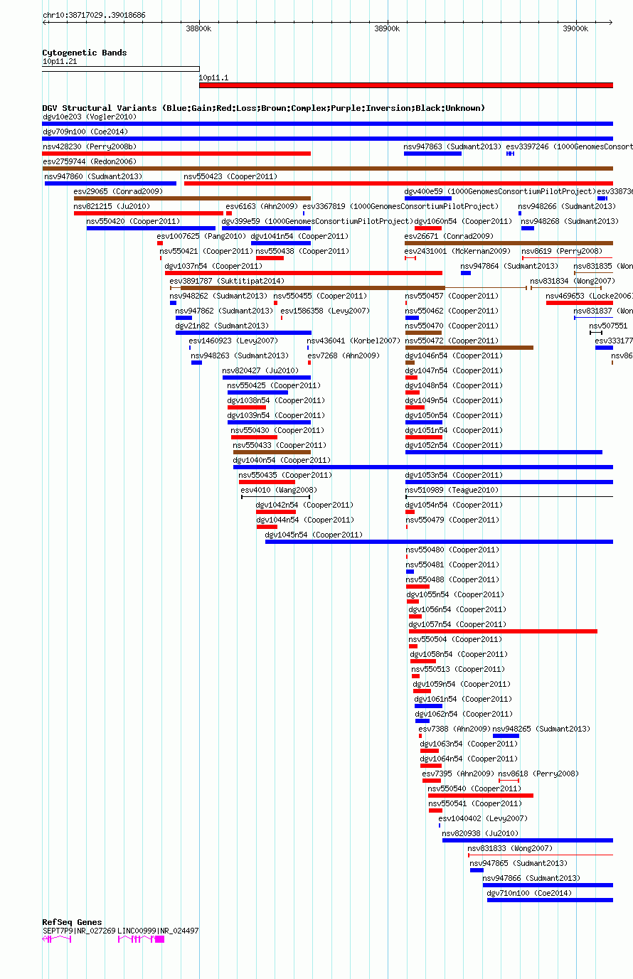 Variant DetailsVariant: esv2757379 | Internal ID | 9979456 | | Landmark | | | Location Information | | | Cytoband | 10p11.1 | | Allele length | | Assembly | Allele length | | hg38 | 297455 | | hg19 | 301658 | | hg18 | 301658 | | hg17 | 301658 |