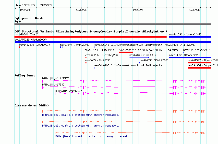 | Variant Type | CNV gain | Copy Number | | Allele State | | Allele Origin | | Probe Count | | Validation Flag | | Merged Status | M | Merged Variants | | Supporting Variants | esv2757074, esv2757945 | Samples | NA19208, NA19206 | Known Genes | BANK1 | Method | BAC aCGH SNP array | Analysis | Array images were acquired using an Agilent laser scanner (Agilent Technologies, UK). Fluorescence intensities and log2 ratio values were extracted using Bluefuse software (Bluegnome Ltd). The algorithm used to call CNVs using the 500K EA platform was developed to accurately define CNV regions using a large set of reference samples and is described in detail in a separate publication (Komura 2006). The algorithm contains three major parts: 1) Intensity pre-processing using an improved version of Genomic Imbalance Map (GIM) (Ishikawa et al. 2005), including probe selection, noise reduction, normalization, and intensity ratio adjustment based on affinity differences between alleles of a SNP, 2) CNV extraction, which identifies CNVs from all pair-wise comparisons using a modified SW-ARRAY, and 3) A copy number inference step which utilizes signal ratios and SNP information to more precisely define CNV boundaries and the copy number within each region. | Platform | Affymetrix GeneChip Early Access Mapping 500K Set Array (250K_Nsp_SNP) Agilent | Comments | | Reference | Redon_et_al_2006 | Pubmed ID | 17122850 | Accession Number(s) | esv2759269