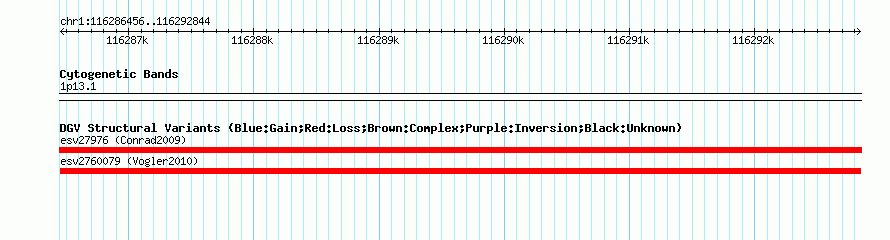 Variant DetailsVariant: esv2760079| Internal ID | 10376387 | | Landmark | | | Location Information | | | Cytoband | 1p13.1 | | Allele length | | Assembly | Allele length | | hg38 | 6389 | | hg19 | 6389 | | hg18 | 6389 |