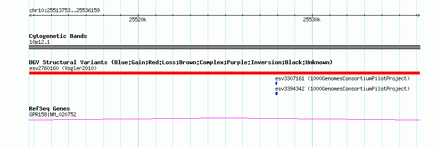Variant DetailsVariant: esv2760160| Internal ID | 10027523 | | Landmark | | | Location Information | | | Cytoband | 10p12.1 | | Allele length | | Assembly | Allele length | | hg38 | 22407 | | hg19 | 22407 | | hg18 | 22407 |