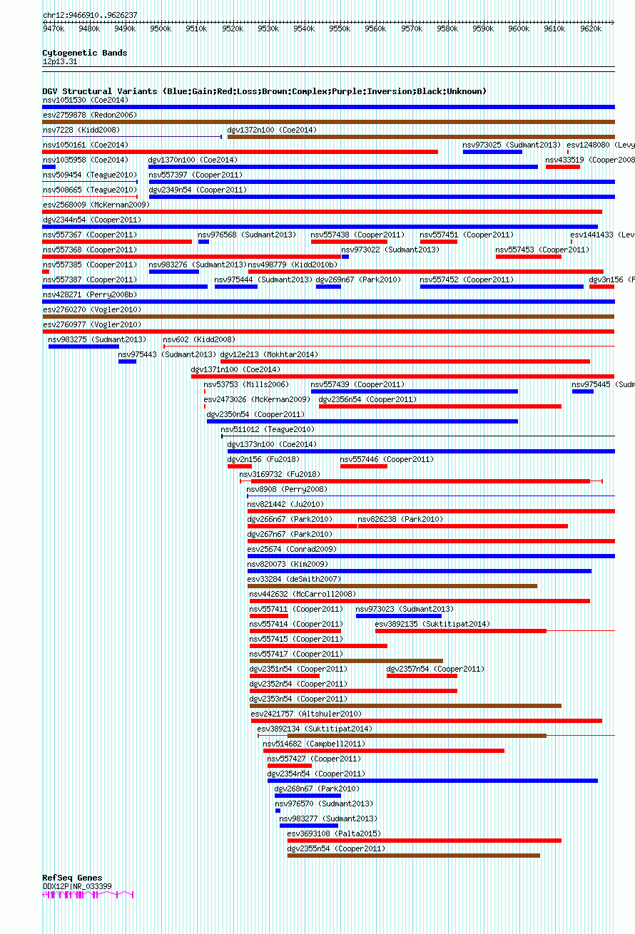 Variant DetailsVariant: esv2760270 | Internal ID | 10376578 | | Landmark | | | Location Information | | | Cytoband | 12p13.31 | | Allele length | | Assembly | Allele length | | hg38 | 159328 | | hg19 | 159328 | | hg18 | 159328 |