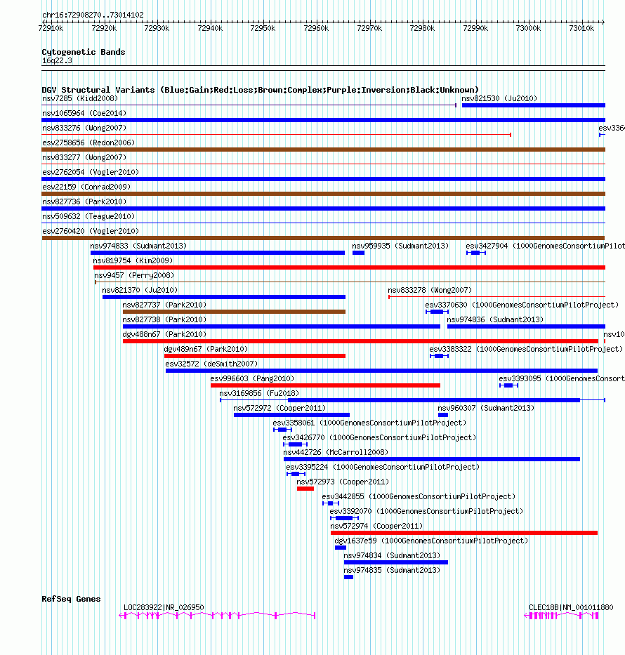Variant DetailsVariant: esv2760420| Internal ID | 10376728 | | Landmark | | | Location Information | | | Cytoband | 16q22.3 | | Allele length | | Assembly | Allele length | | hg38 | 105833 | | hg19 | 105833 | | hg18 | 105833 |