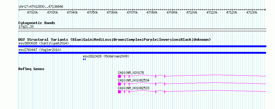 Variant DetailsVariant: esv2760447| Internal ID | 10376755 | | Landmark | | | Location Information | | | Cytoband | 17q21.33 | | Allele length | | Assembly | Allele length | | hg38 | 124018 | | hg19 | 124017 | | hg18 | 124017 |
