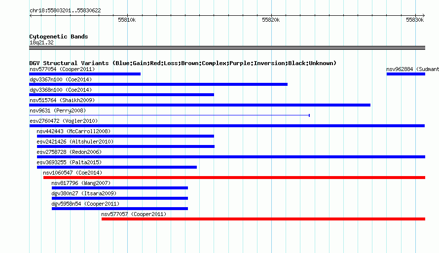 Variant DetailsVariant: esv2760472 | Internal ID | 10376780 | | Landmark | | | Location Information | | | Cytoband | 18q21.32 | | Allele length | | Assembly | Allele length | | hg38 | 27422 | | hg19 | 27422 | | hg18 | 27422 |