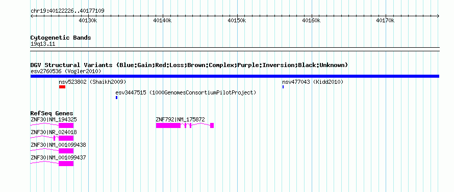 Variant DetailsVariant: esv2760536| Internal ID | 10376844 | | Landmark | | | Location Information | | | Cytoband | 19q13.11 | | Allele length | | Assembly | Allele length | | hg38 | 54884 | | hg19 | 54884 | | hg18 | 54884 |