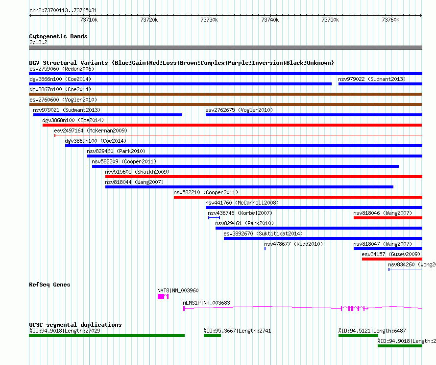 | Variant Type | CNV gain+loss | Copy Number | | Allele State | | Allele Origin | | Probe Count | | Validation Flag | | Merged Status | M | Merged Variants | | Supporting Variants | essv7007694, essv7007695 | Samples | RW_0666, RW_0207 | Known Genes | ALMS1P, NAT8 | Method | Merging | Analysis | Two different algorithms (PennCNV and Birdseye) were applied to detect CNVs. Only congruent CNV events regarding direction of effect that were detected by both algorithms were merged using the outer borders of the event in a first step. In a second step only CNVs that were detected in at least two individuals were merged into a CNVR. | Platform | Merging | Comments | | Reference | Vogler_et_al_2010 | Pubmed ID | 21179565 | Accession Number(s) | esv2760600