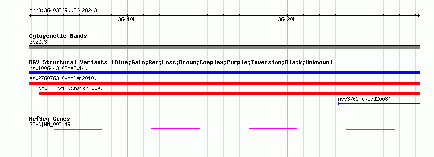 Variant DetailsVariant: esv2760763| Internal ID | 10377070 | | Landmark | | | Location Information | | | Cytoband | 3p22.3 | | Allele length | | Assembly | Allele length | | hg38 | 24375 | | hg19 | 24375 | | hg18 | 24375 |