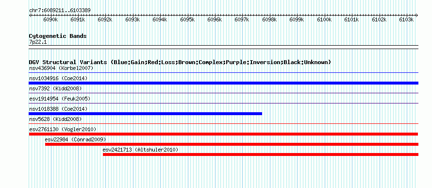Variant DetailsVariant: esv2761130| Internal ID | 10377437 | | Landmark | | | Location Information | | | Cytoband | 7p22.1 | | Allele length | | Assembly | Allele length | | hg38 | 14179 | | hg19 | 14179 | | hg18 | 14179 |
