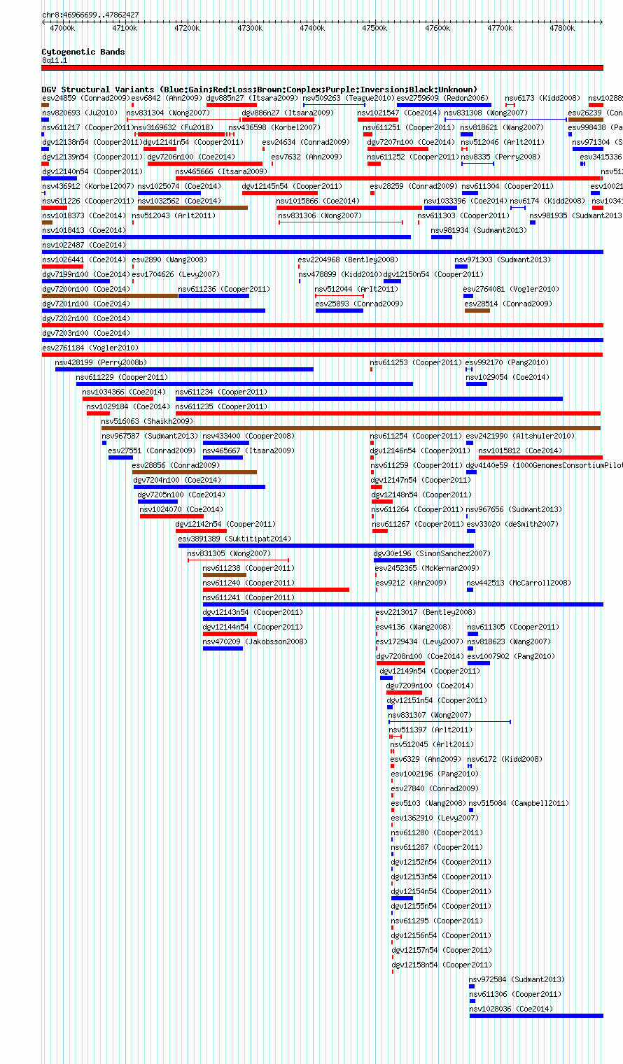 Variant DetailsVariant: esv2761184| Internal ID | 10377491 | | Landmark | | | Location Information | | | Cytoband | 8q11.1 | | Allele length | | Assembly | Allele length | | hg38 | 895729 | | hg19 | 895729 | | hg18 | 895729 |