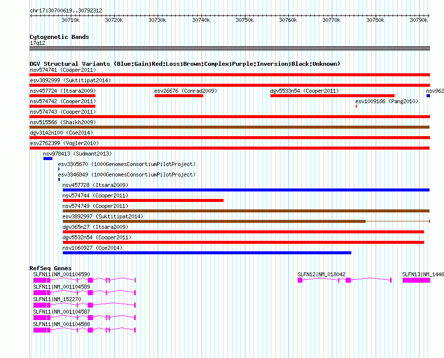 Variant DetailsVariant: esv2762399| Internal ID | 10375197 | | Landmark | | | Location Information | | | Cytoband | 17q12 | | Allele length | | Assembly | Allele length | | hg38 | 91694 | | hg19 | 91694 | | hg18 | 91694 |